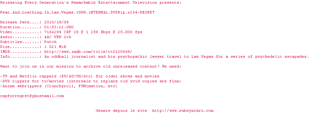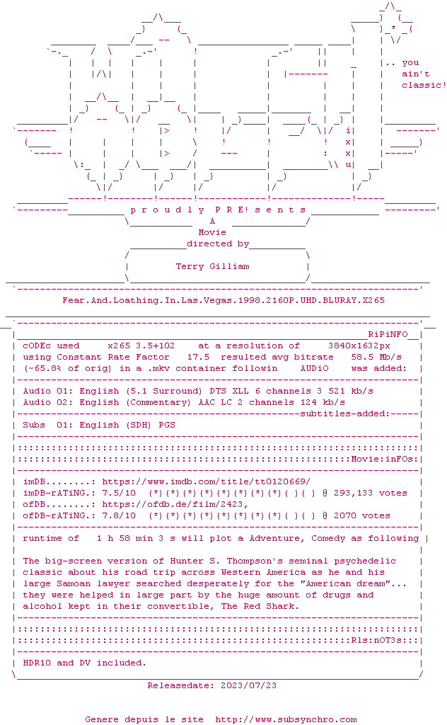 Le commentaire de Yaumegui Commente par Yaumegui (554), Le Dimanche 11 Mai 2014 à 18h48 Le journalisme Gonzo ne pourra jamais être rendu dans un film de fiction. Le journalisme Gonzo, c'est du grand reportage, de la non fiction, avec le Moi du journaliste en avant. Il faut lire les bouquins du grand Hunter S. Thompson, les films tirés de son oeuvre ne seront jamais à la hauteur. Sinon, c'est un film assez marrant à voir. 6.5 / 10 0 0