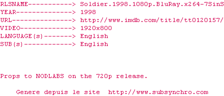 Y avez-vous pense ? Nous proposons déjà 1882 sous-titres pour le film Soldier. Avez-vous essaye de voir si ces sous-titres etaient compatibles avec cette release ? On vous laisse le soin de tester cela pour nous et de contribuer au site en postant le sous-titre en cas de compatiblite constatee !