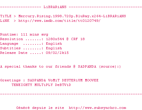 Voir le nfo de la release Mercury.Rising.1998.iNTERNAL.720p.BluRay.x264-LiBRARiANS