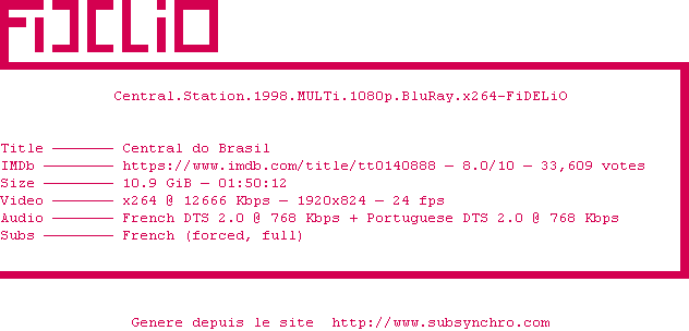 Voir le nfo de la release Central.Station.1998.MULTi.1080p.BluRay.x264-FiDELiO FiDELiO Central.Station.1998.MULTi.1080p.BluRay.x264-FiDELiO OpenSubtitles 0 fichier