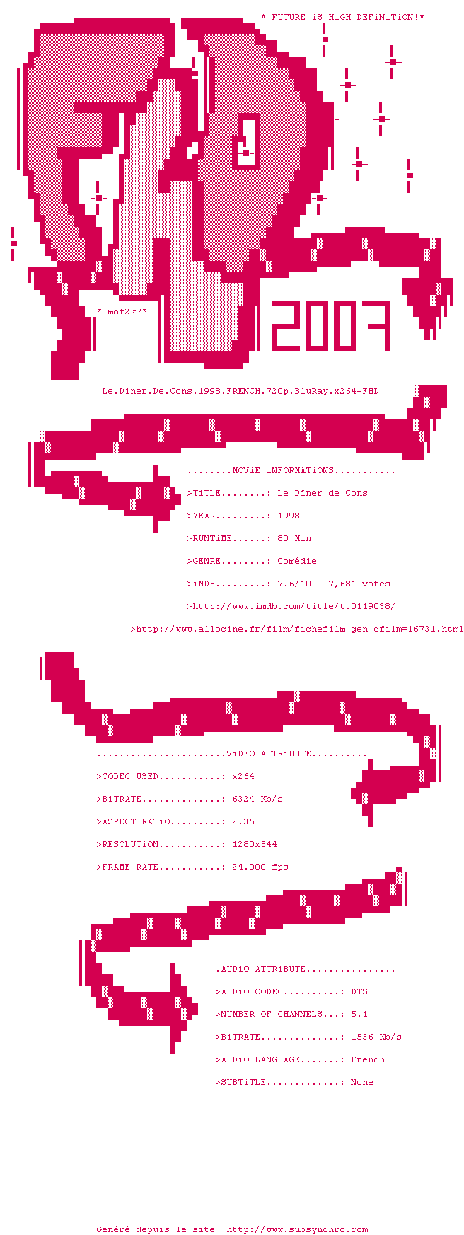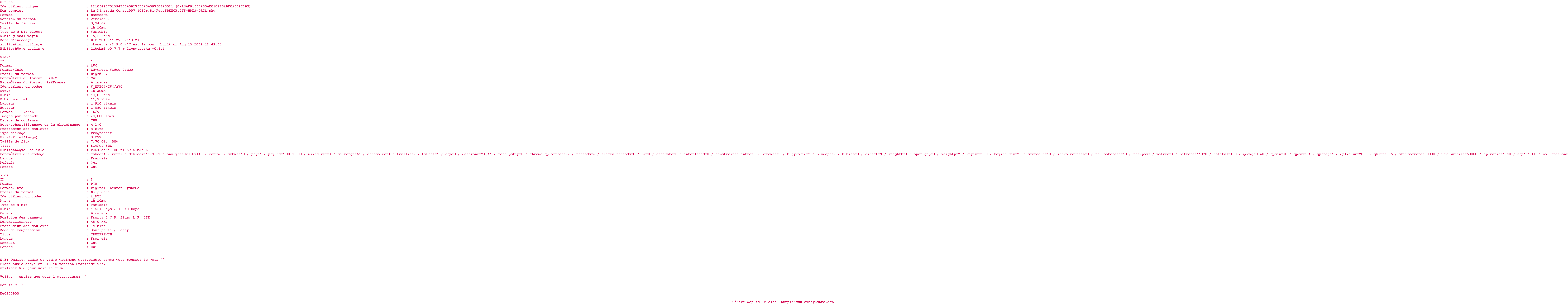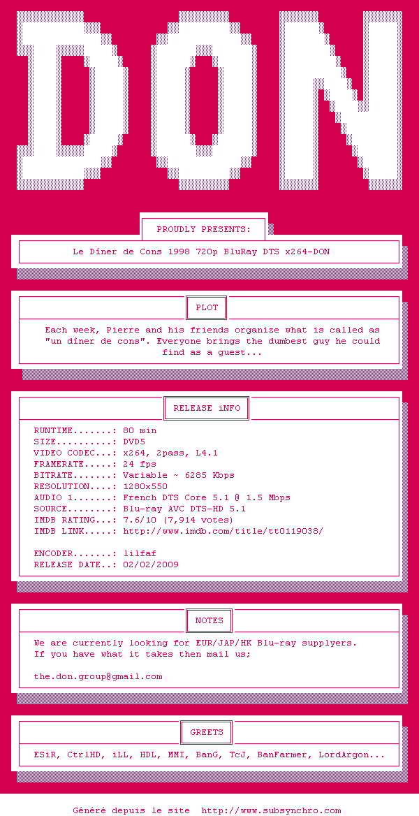 Voir le nfo de la release Le.Diner.De.Cons.1998.FRENCH.1080p.BluRay.x264-FHD