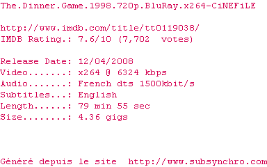 Voir le nfo de la release The.Dinner.Game.1998.720p.BluRay.x264-CiNEFiLE