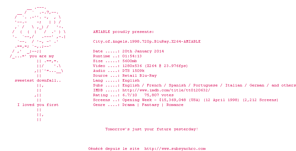 Voir le nfo de la release City.of.Angels.1998.1080p.BluRay.X264-AMIABLE