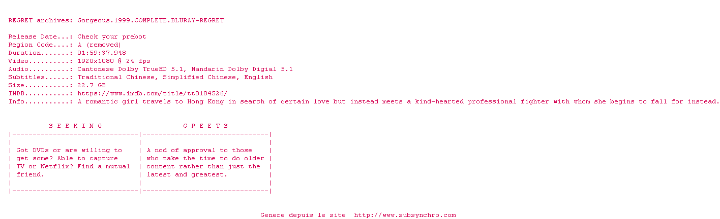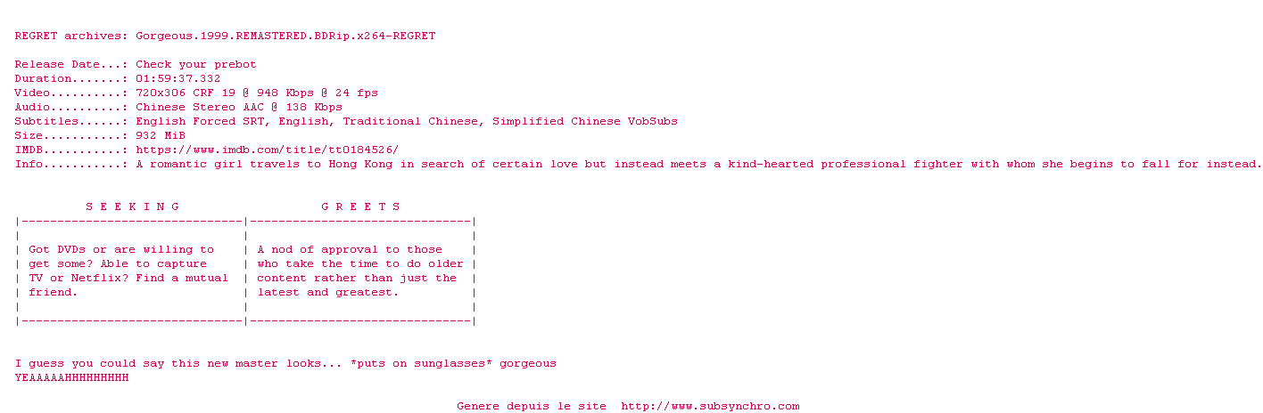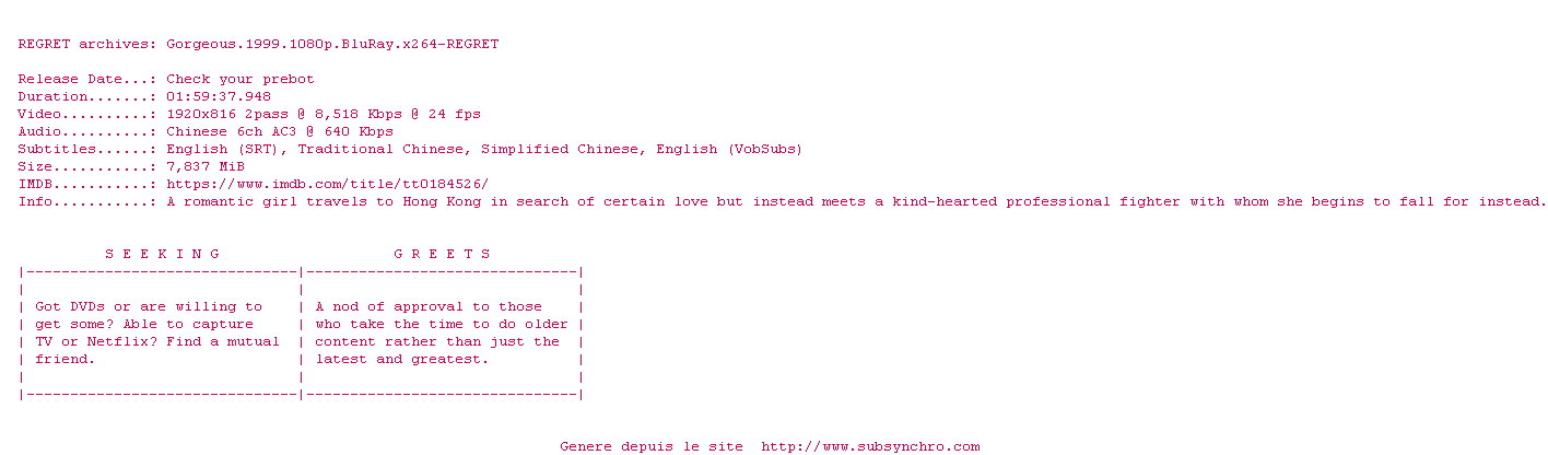 Voir le nfo de la release Gorgeous.1999.REMASTERED.BDRip.x264-REGRET