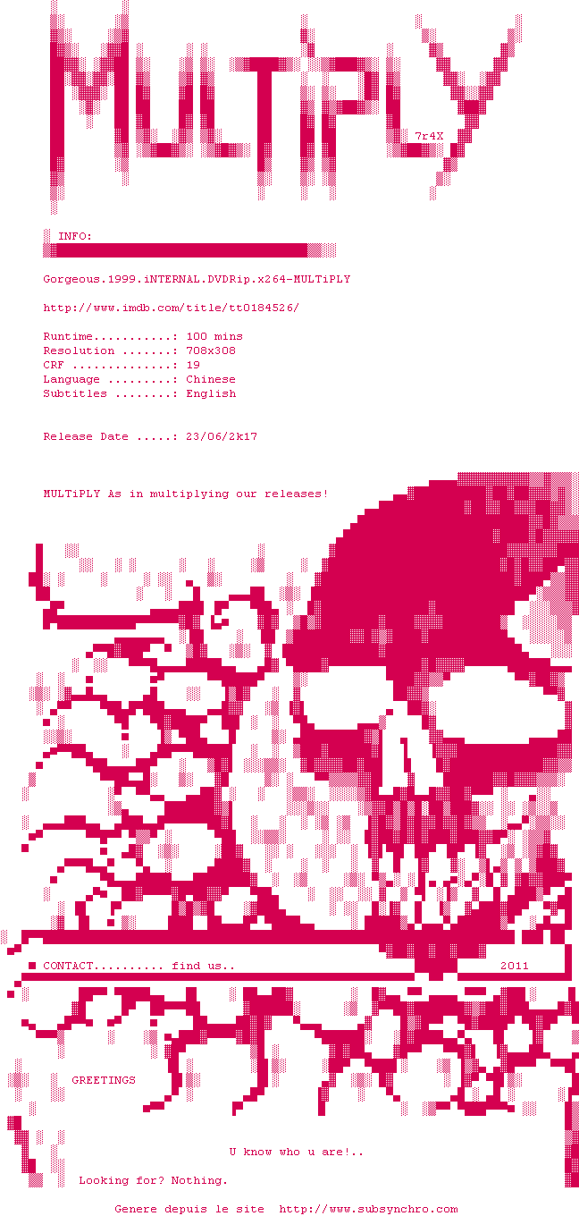 Voir le nfo de la release Gorgeous.1999.iNTERNAL.DVDRip.x264-MULTiPLY