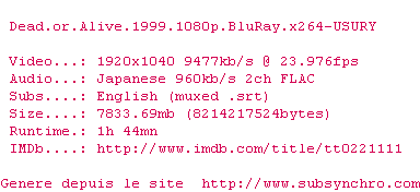 Voir le nfo de la release Dead.Or.Alive.1999.1080p.BluRay.x264-USURY