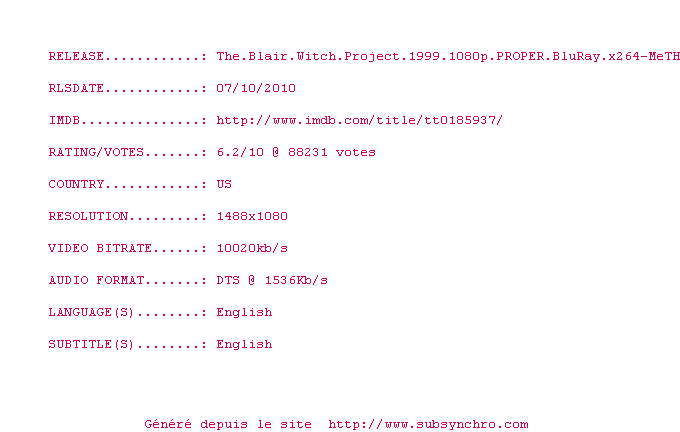 Voir le nfo de la release The.Blair.Witch.Project.1999.1080p.PROPER.BluRay.x264-MeTH