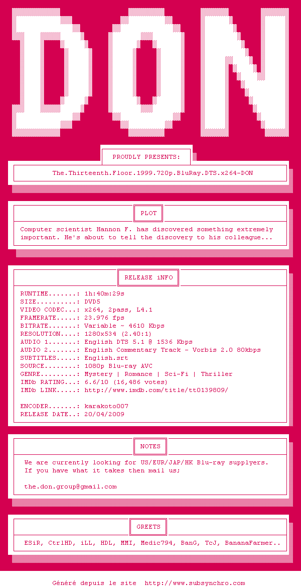 Voir le nfo de la release The.Thirteenth.Floor.1999.720p.BluRay.DTS.x264-DON