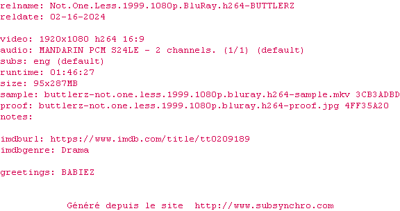| Voir le nfo de la release Not.One.Less.1999.1080p.BluRay.H264-BUTTLERZ | BUTTLERZ | Not.One.Less.1999.1080p.BluRay.H264-BUTTLERZ OpenSubtitles | 0 fichier | ||