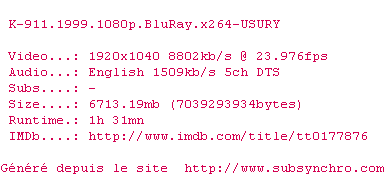 Voir le nfo de la release K-911.1999.1080p.BluRay.x264-USURY