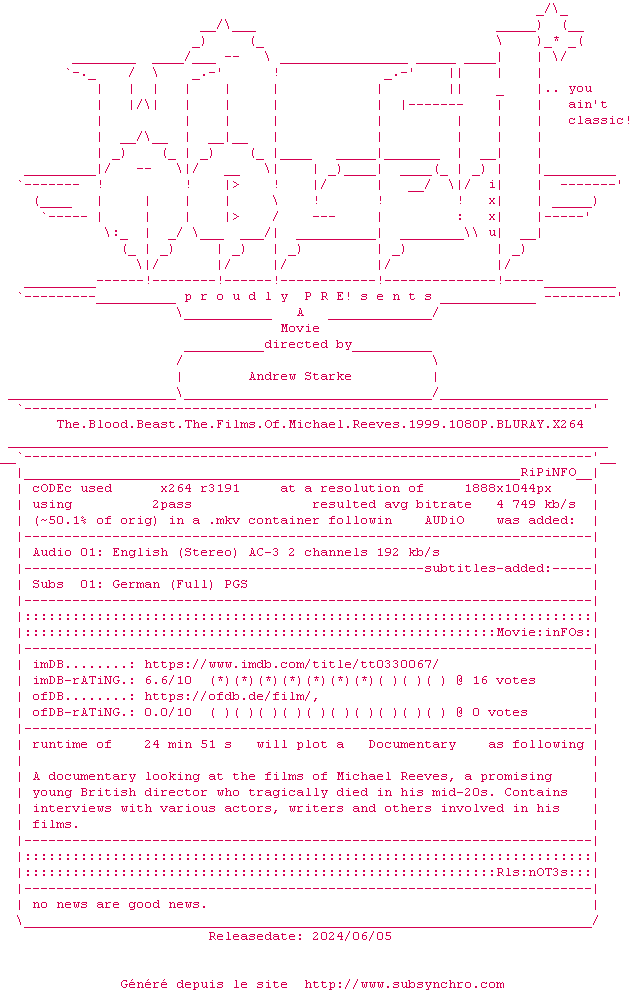 Voir le nfo de la release The.Blood.Beast.The.Films.Of.Michael.Reeves.1999.1080P.BLURAY.x264-WATCHABLE
