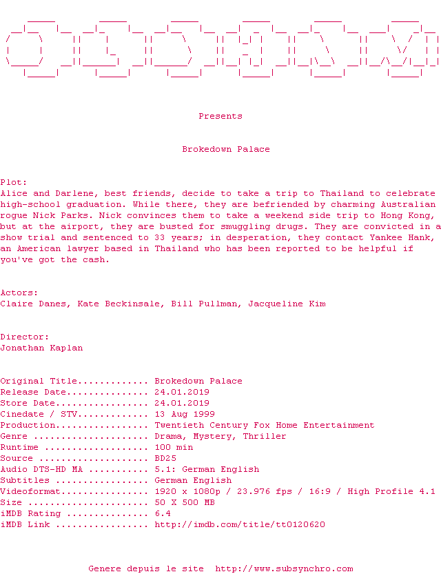 Voir le nfo de la release Brokedown.Palace.1999.MULTi.COMPLETE.BLURAY-OLDHAM