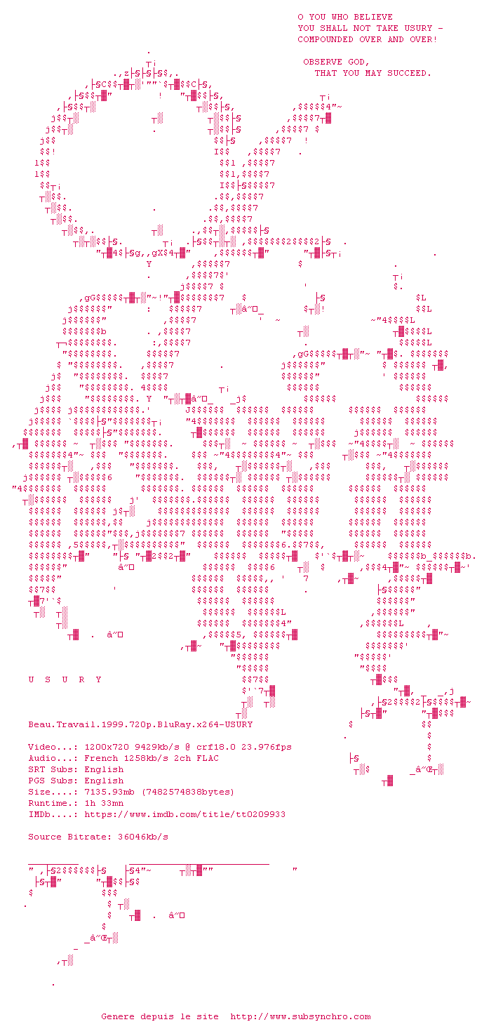 Y avez-vous pense ? Nous proposons déjà 1917 sous-titres pour le film Beau travail. Avez-vous essaye de voir si ces sous-titres etaient compatibles avec cette release ? On vous laisse le soin de tester cela pour nous et de contribuer au site en postant le sous-titre en cas de compatiblite constatee !