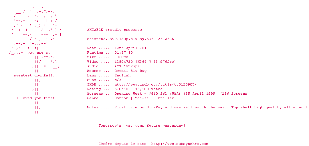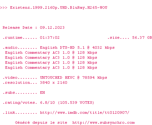 Dans un avenir proche, une créatrice de génie, Allegra Geller, a inventé une nouvelle génération de jeu qui se connecte directement au système nerveux : eXistenZ. Lors de la séance de présentation du jeu, un fanatique cherche à la tuer. Un jeune stagiaire en marketing, Ted Pikul, sauve la vie d'Allegra. Une poursuite effrénée s'engage autant dans la réalité que dans l'univers trouble et mystérieux du jeu.