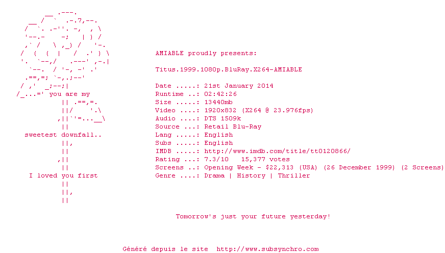 | AMIABLE | Titus.1999.1080p.BluRay.x264-AMIABLE OpenSubtitles | 0 fichier | |||