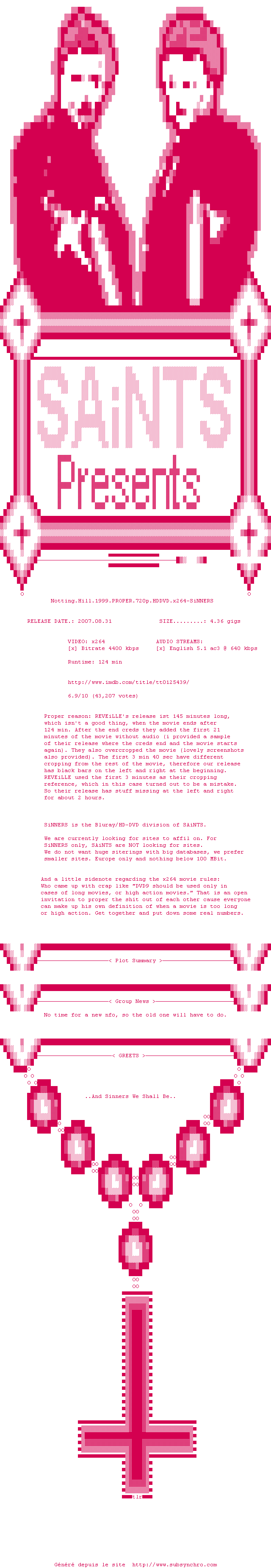 Voir le nfo de la release Notting.Hill.1999.PROPER.720p.HDDVD.x264-SiNNERS