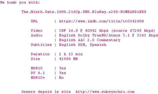 Y avez-vous pense ? Nous proposons déjà 1954 sous-titres pour le film La Neuvième porte. Avez-vous essaye de voir si ces sous-titres etaient compatibles avec cette release ? On vous laisse le soin de tester cela pour nous et de contribuer au site en postant le sous-titre en cas de compatiblite constatee !