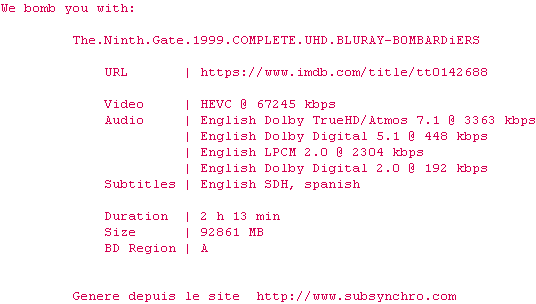 Y avez-vous pense ? Nous proposons déjà 1955 sous-titres pour le film La Neuvième porte. Avez-vous essaye de voir si ces sous-titres etaient compatibles avec cette release ? On vous laisse le soin de tester cela pour nous et de contribuer au site en postant le sous-titre en cas de compatiblite constatee !