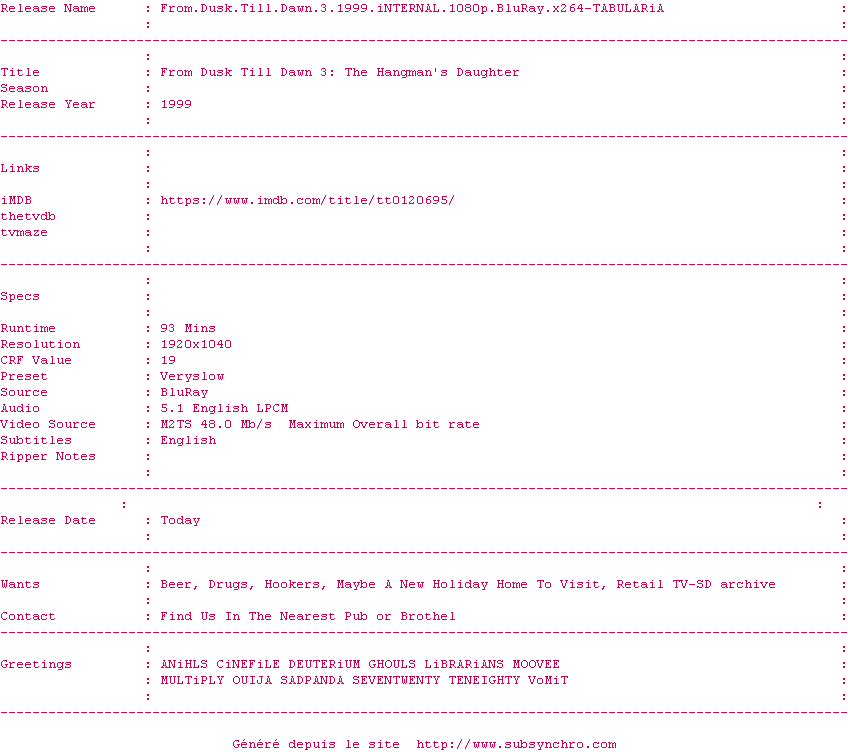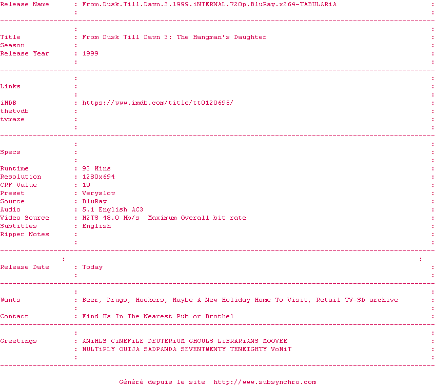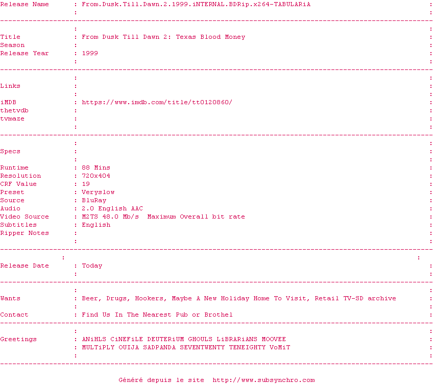 Voir le nfo de la release From.Dusk.Till.Dawn.3.1999.iNTERNAL.720p.BluRay.x264-TABULARiA