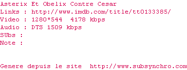 Y avez-vous pense ? Nous proposons déjà 1051 sous-titres pour le film Astérix et Obélix contre César. Avez-vous essaye de voir si ces sous-titres etaient compatibles avec cette release ? On vous laisse le soin de tester cela pour nous et de contribuer au site en postant le sous-titre en cas de compatiblite constatee !