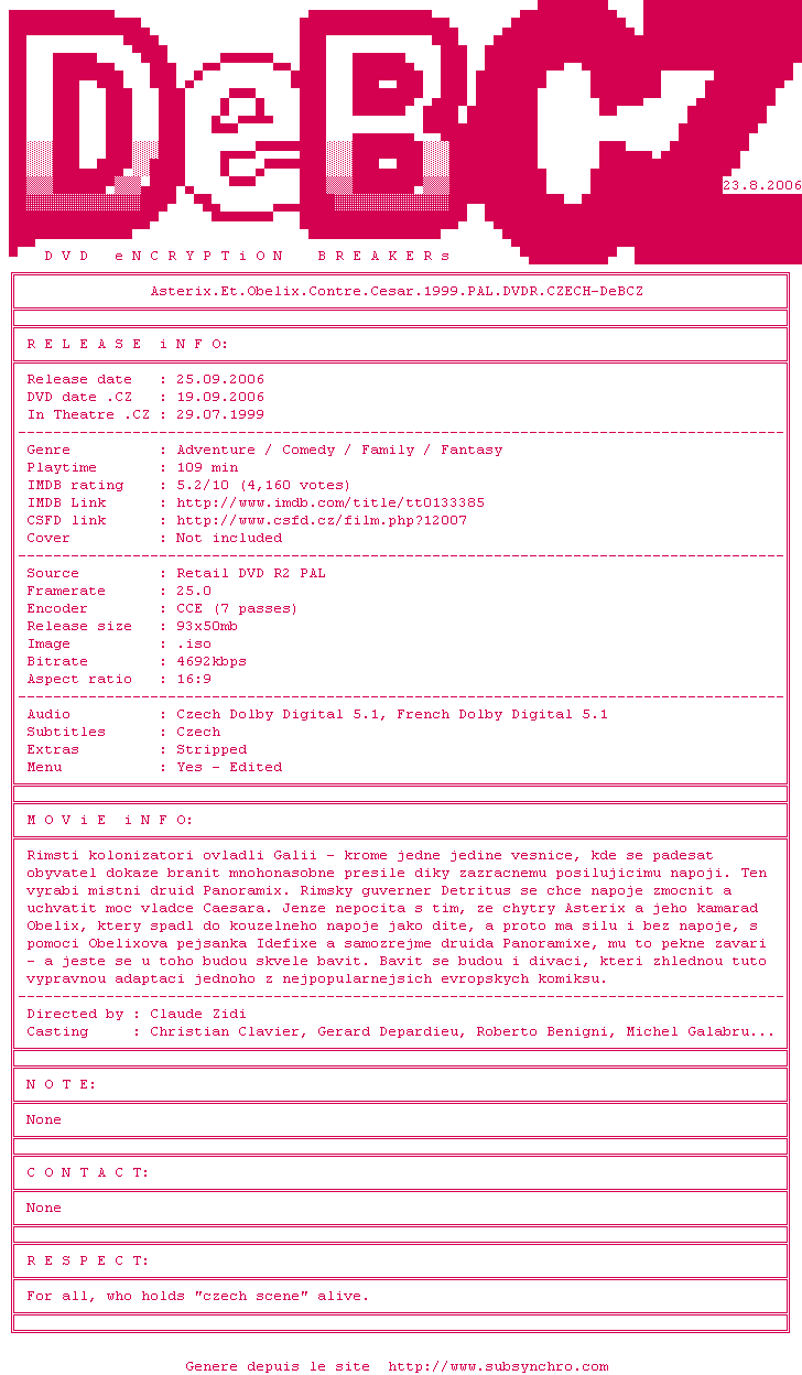Y avez-vous pense ? Nous proposons déjà 1051 sous-titres pour le film Astérix et Obélix contre César. Avez-vous essaye de voir si ces sous-titres etaient compatibles avec cette release ? On vous laisse le soin de tester cela pour nous et de contribuer au site en postant le sous-titre en cas de compatiblite constatee !