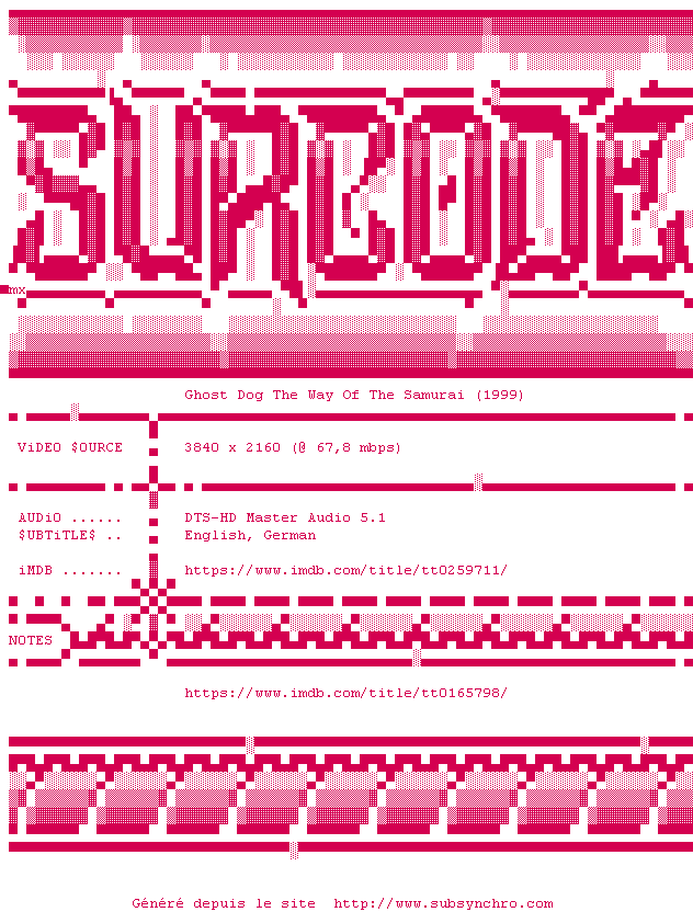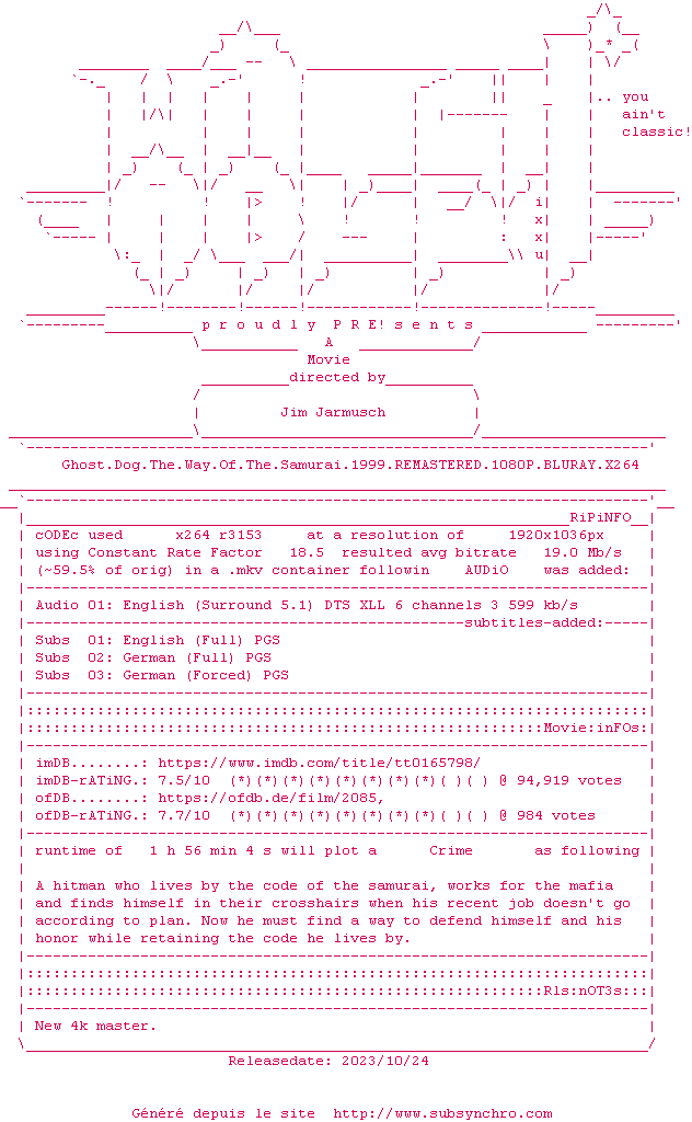 C'est au milieu des oiseaux, dans une cabane perchee sur le toit d'un immeuble abandonne, que Ghost Dog etudie un ancien texte samourai. Ghost Dog est un tueur professionnel qui se fond dans la nuit et se glisse dans la ville. Quand son code moral est trahi par le dysfonctionnement d'une famille mafieuse qui l'emploie de temps a autre, il reagit strictement selon le code samourai.