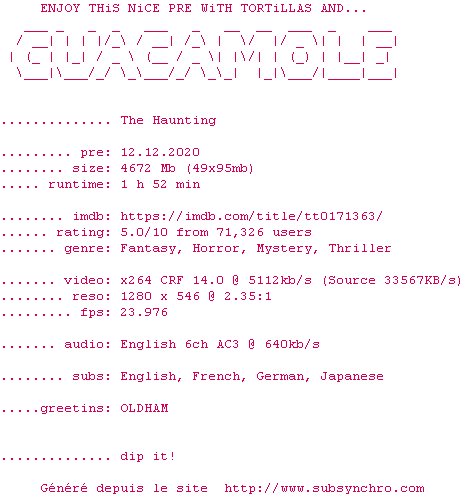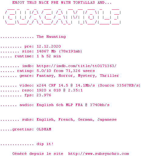 Voir le nfo de la release The.Haunting.1999.720p.BluRay.x264-GUACAMOLE