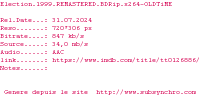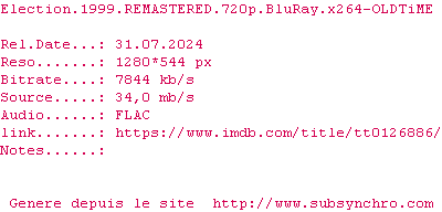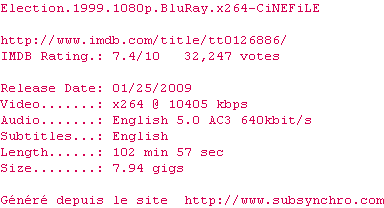 Voir le nfo de la release Election.1999.REMASTERED.1080p.BluRay.x264-OLDTiME