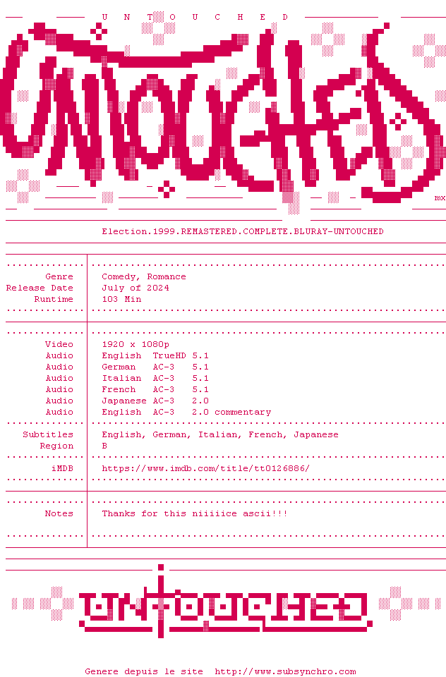 Voir le nfo de la release Election.1999.REMASTERED.COMPLETE.BLURAY-UNTOUCHED