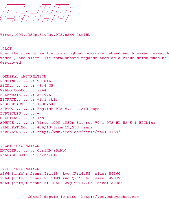 Voir le nfo de la release Virus.1999.1080p.BluRay.x264-PSYCHD