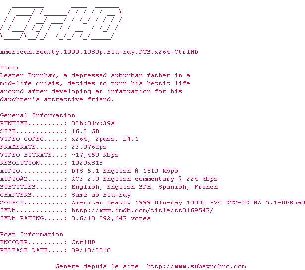 Nfo de la release American.Beauty.1999.1080p.Blu-ray.DTS.x264-CtrlHD