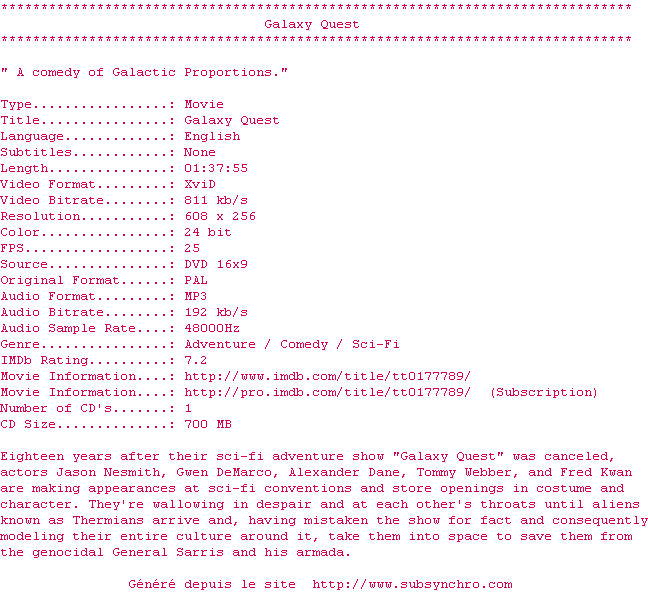 Telechargez le RSS « Fichier de la release Galaxy.Quest.1999.DVDRip.XviD.iNT-MF »