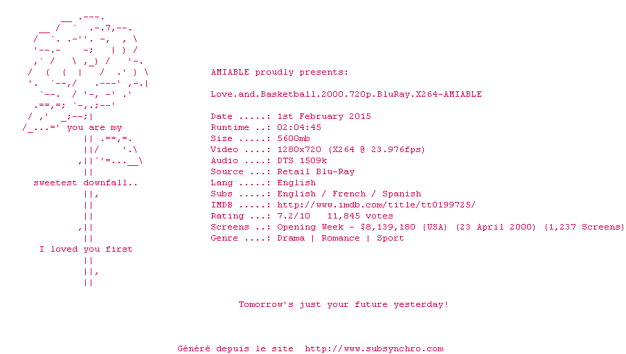 Voir le nfo de la release Love.and.Basketball.2000.720p.BluRay.X264-AMIABLE