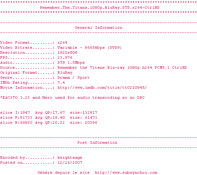 Voir le nfo de la release Remember.The.Titans.1080p.BluRay.DTS.x264-CtrlHD