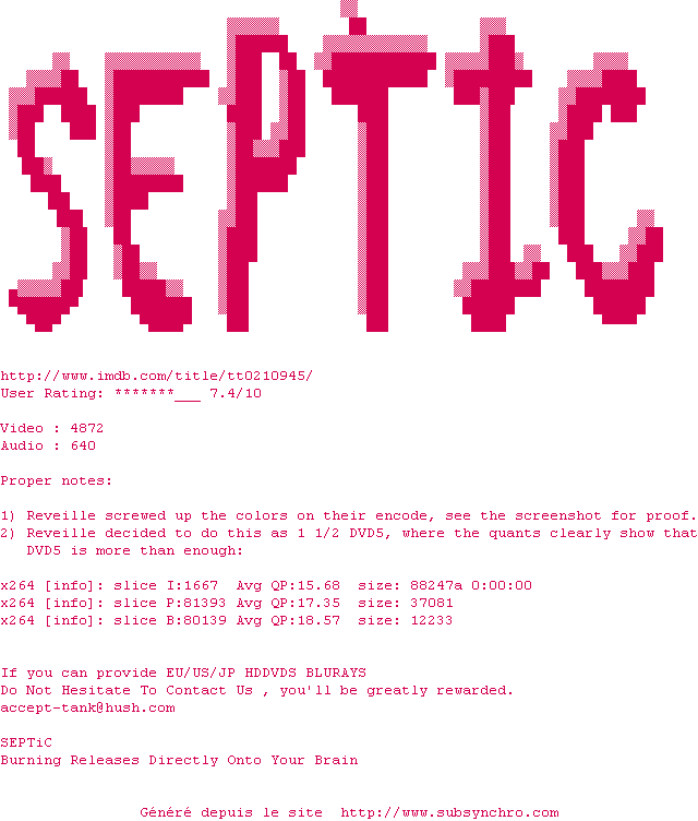 Voir le nfo de la release Remember.The.Titans.2000.PROPER.720p.BluRay.x264-SEPTiC