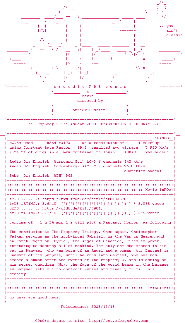Voir le nfo de la release The.Prophecy.3.The.Ascent.2000.REMASTERED.720P.BLURAY.x264-WATCHABLE