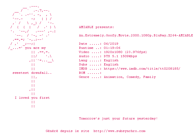 | Voir le nfo de la release An.Extremely.Goofy.Movie.2000.1080p.BluRay.x264-AMIABLE | AMIABLE | An.Extremely.Goofy.Movie.2000.1080p.BluRay.x264-AMIABLE OpenSubtitles | 0 fichier |