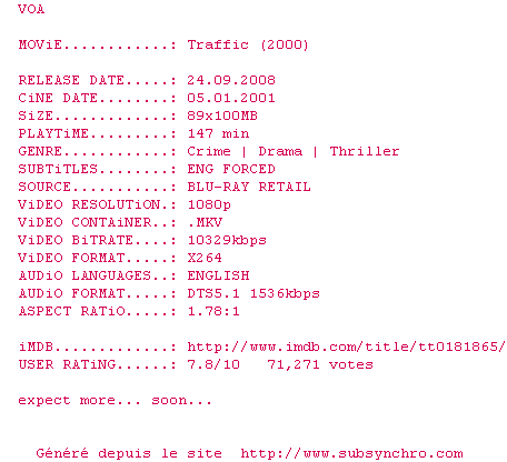 Voir le nfo de la release Traffic.2000.1080p.BluRay.x264-VOA
