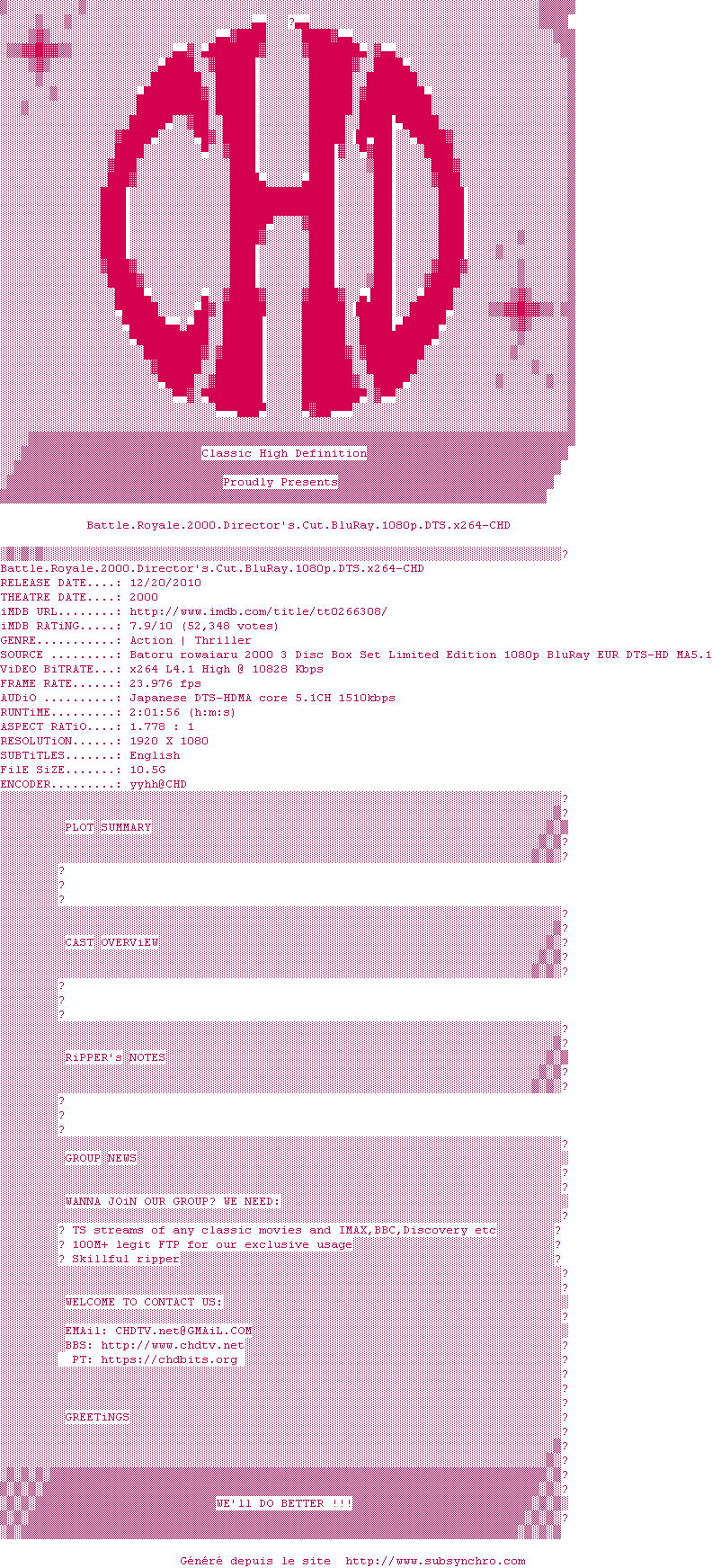 Voir le nfo de la release Battle.Royale.2000.Directors.Cut.BluRay.1080p.DTS.x264-CHD