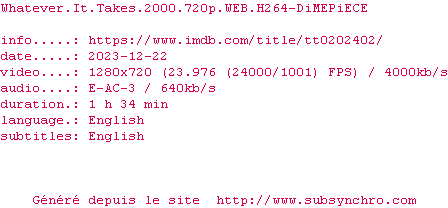 | DiMEPiECE | Whatever.It.Takes.2000.1080p.WEB.H264-DiMEPiECE OpenSubtitles | 0 fichier | |||