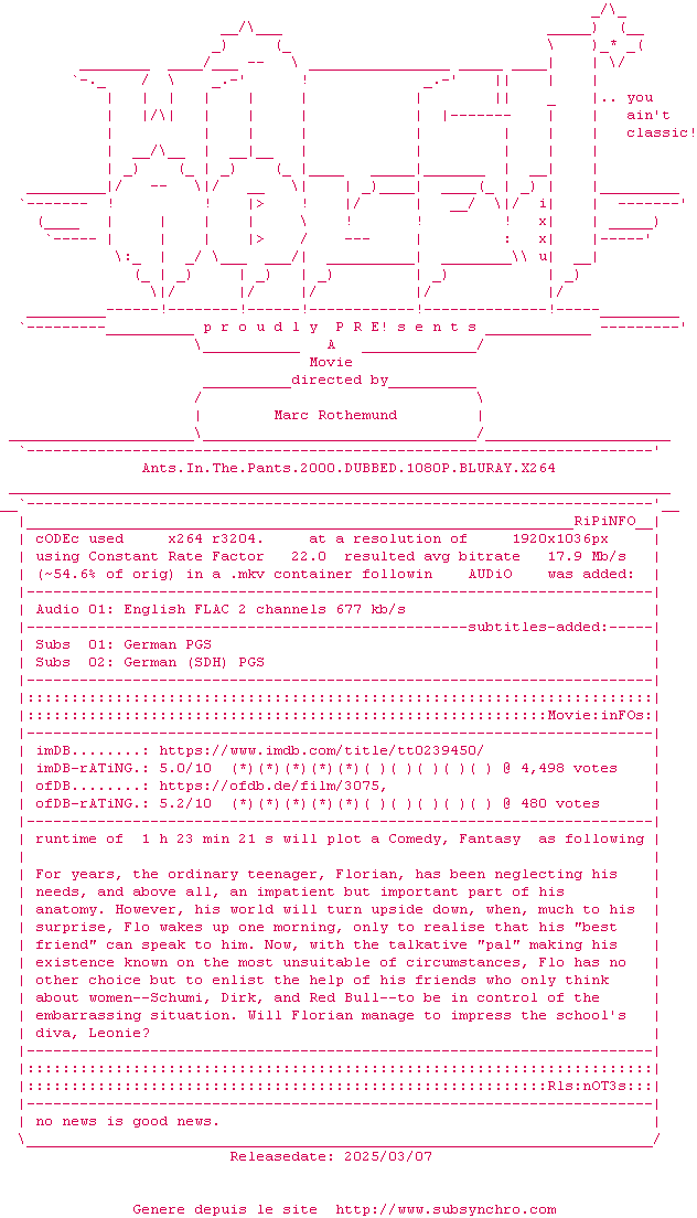 Voir le nfo de la release Ants.In.The.Pants.2000.DUBBED.1080P.BLURAY.H264-UNDERTAKERS