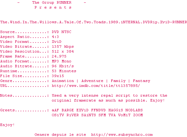 Voir le nfo de la release The.Wind.In.The.Willows.A.Tale.Of.Two.Toads.1989.iNTERNAL.DVDRip.XviD-RUNNER