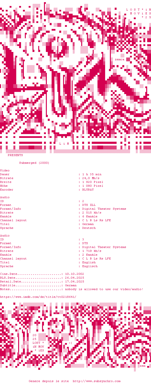 | Voir le nfo de la release Submerged.2000.MULTi.COMPLETE.BLURAY-LIM | LIM | Submerged.2000.MULTi.COMPLETE.BLURAY-LIM OpenSubtitles | 0 fichier |