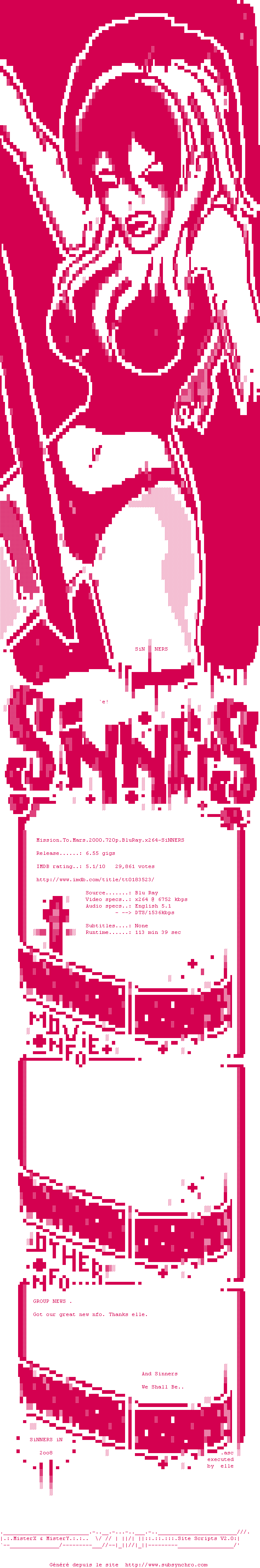 Voir le nfo de la release Mission.To.Mars.2000.720p.BluRay.x264-SiNNERS