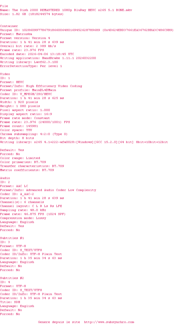Y avez-vous pense ? Nous proposons déjà 1485 sous-titres pour le film The Dish. Avez-vous essaye de voir si ces sous-titres etaient compatibles avec cette release ? On vous laisse le soin de tester cela pour nous et de contribuer au site en postant le sous-titre en cas de compatiblite constatee !