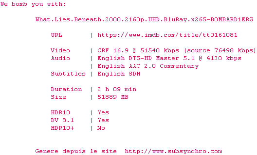 Voir le nfo de la release What.Lies.Beneath.2000.2160p.UHD.BluRay.H265-MALUS