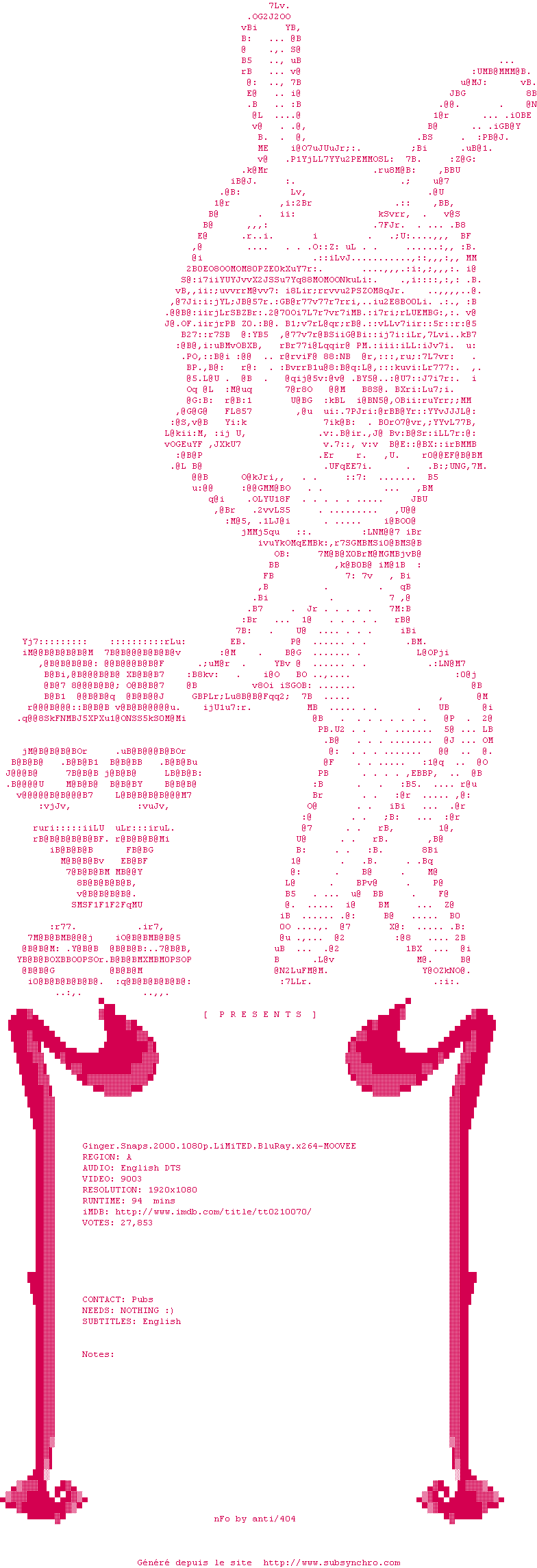 Voir le nfo de la release Ginger.Snaps.2000.1080p.LiMiTED.BluRay.x264-MOOVEE