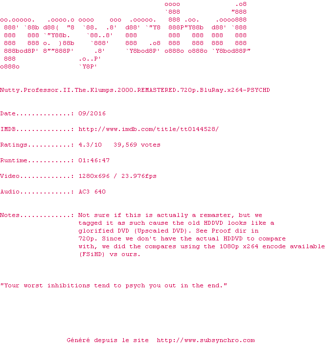 Voir le nfo de la release Nutty.Professor.II.The.Klumps.2000.REMASTERED.720p.BluRay.x264-PSYCHD