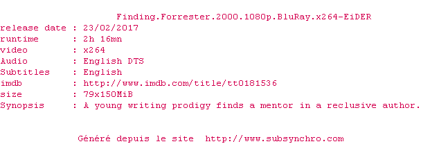 Telechargez le RSS « Fichier de la release Finding.Forrester.2000.1080p.BluRay.x264-EiDER »