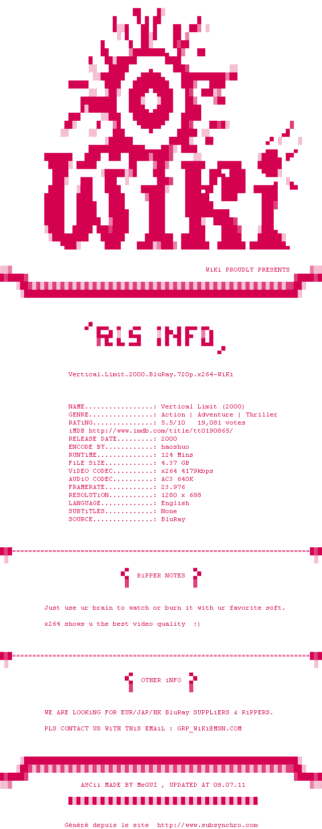 Y avez-vous pense ? Nous proposons déjà 1398 sous-titres pour le film Vertical Limit. Avez-vous essaye de voir si ces sous-titres etaient compatibles avec cette release ? On vous laisse le soin de tester cela pour nous et de contribuer au site en postant le sous-titre en cas de compatiblite constatee !